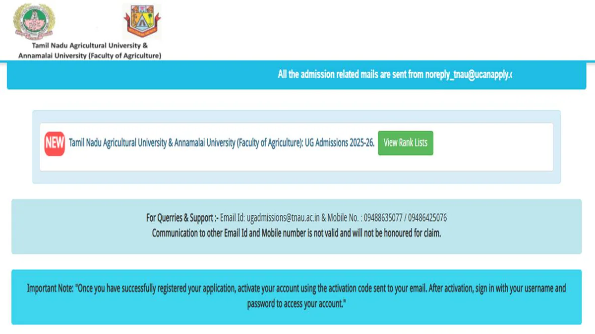 तमिलनाडु एग्रीकल्चर और अन्नामलाई विश्वविद्यालय ने बुधवार, 25 जून 2025 को विभिन्न स्नातक कृषि पाठ्यक्रमों के लिए अपनी रैंक लिस्ट जारी कर दी जिन उम्मीदवारों ने समय सीमा के भीतर एडमिशन के लिए रजिस्ट्रेशन पूरा कराया था वह इस रैंक सूची को आधिकारिक वेबसाइट tnau.ucanapply.com से डाउनलोड कर सकते हैं। रैंक लिस्ट पीडीएफ फाइल फॉर्मेट में वेबसाइट पर उपलब्ध है।